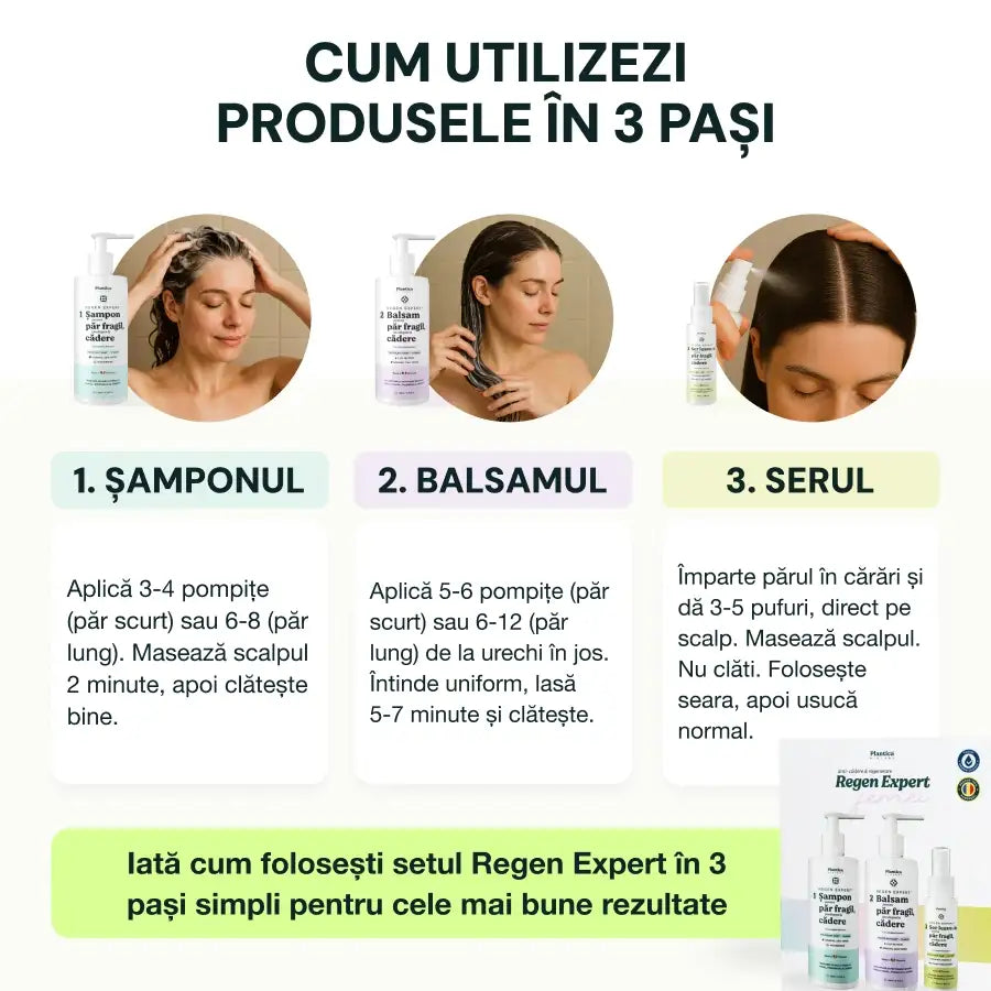 Se recomandă utilizarea șamponului și balsamului de 2-3 ori pe săptămână, iar serul trebuie aplicat zilnic pe scalp, prin masaj ușor, indiferent dacă părul este spălat sau nu.