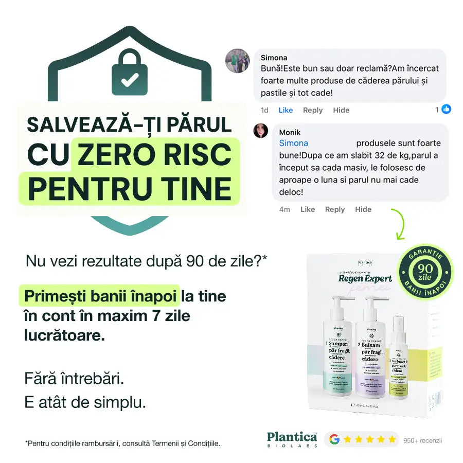 Dacă ai urmat toți pașii și nu observi nicio schimbare după 90 de zile, trimite-ne pozele "înainte și după" la contact@plantica.ro împreună cu dovada achiziției produselor. Îți vom returna toți banii, fără alte întrebări.