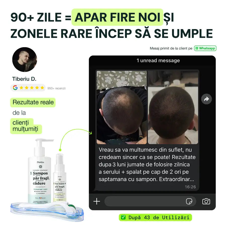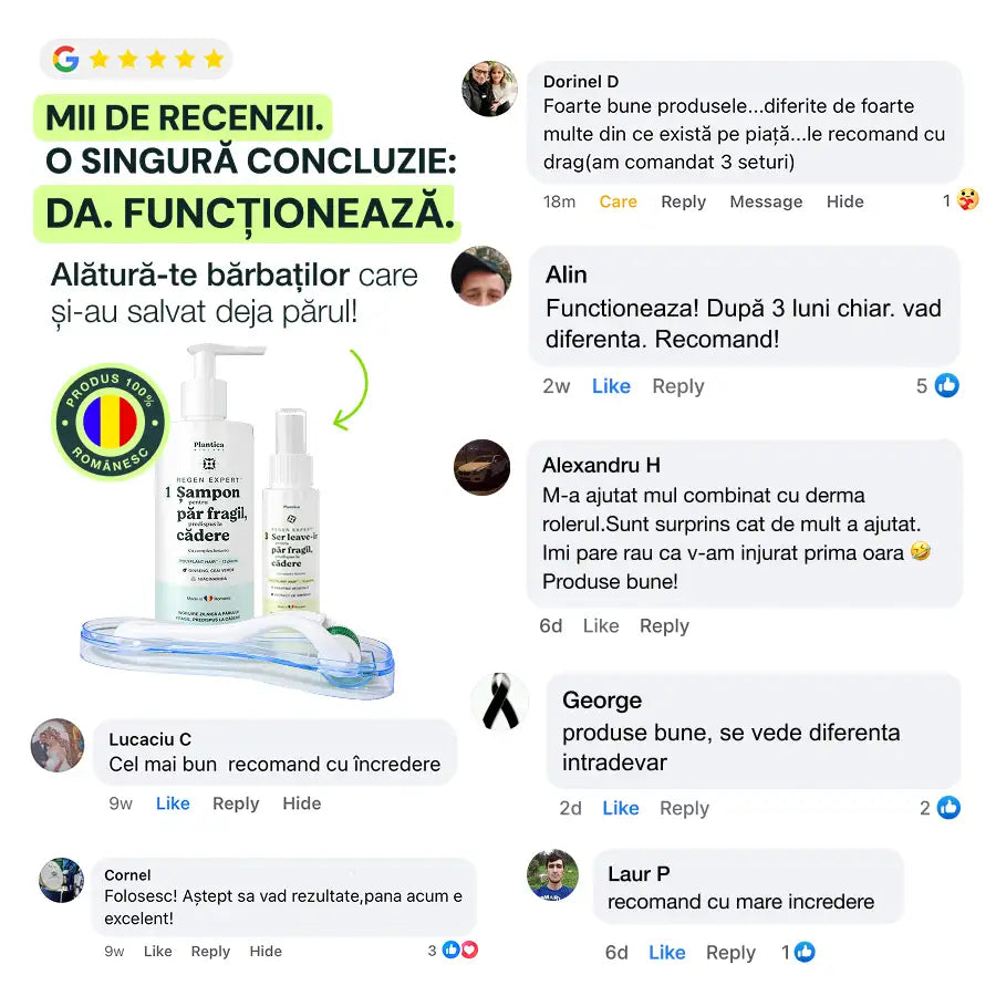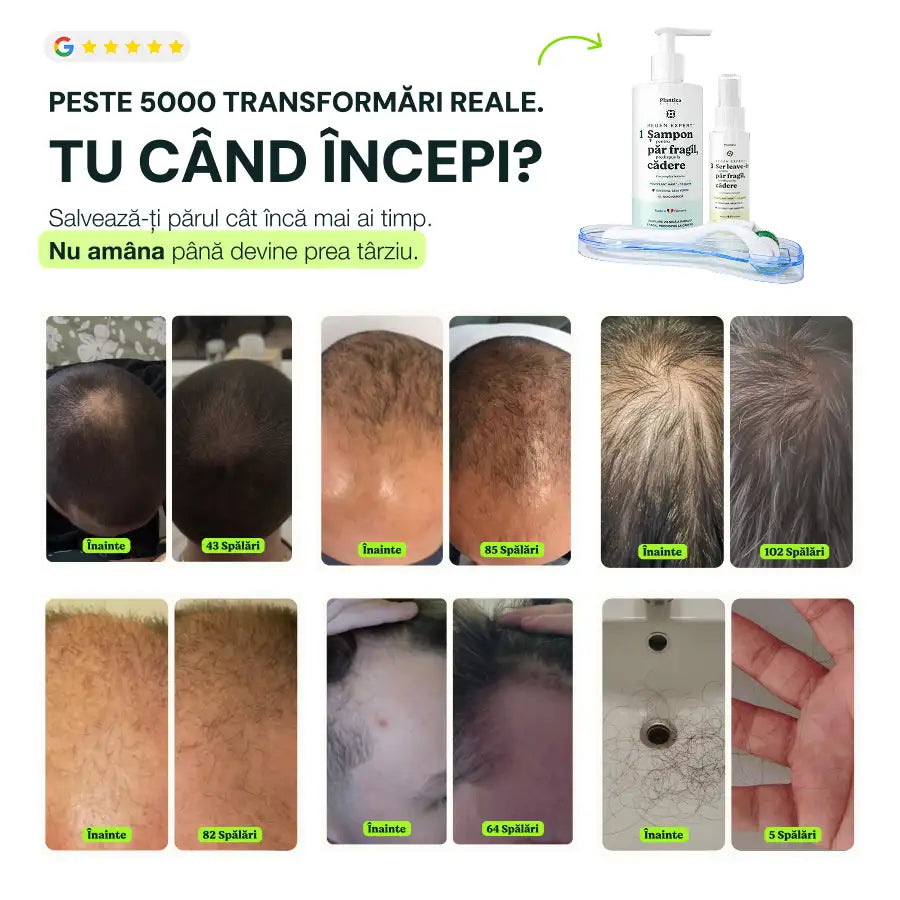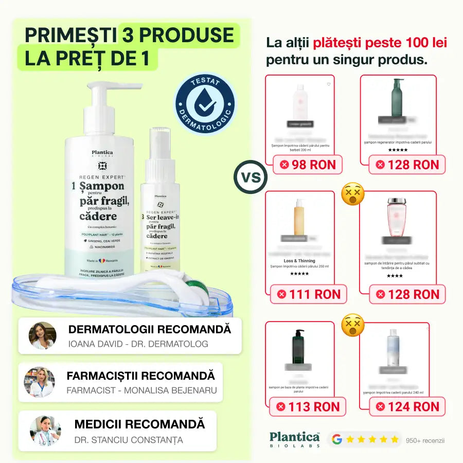 Diferența este formula și combinația. Conțin de 5–7 ori mai multe extracte botanice active decât media pieței și combină 3 produse într-un singur program complet: șampon pentru căderea părului, derma roller și ser tratament regenerare păr.