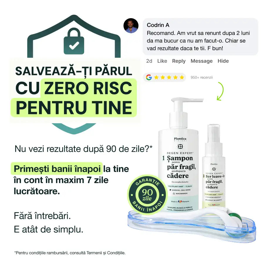 Dacă ai urmat toți pașii și nu observi nicio schimbare după 90 de zile, trimite-ne pozele "înainte și după" la contact@plantica.ro împreună cu dovada achiziției produselor. Îți vom returna toți banii, fără alte întrebări.